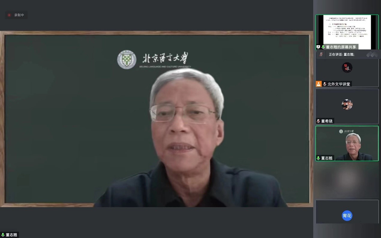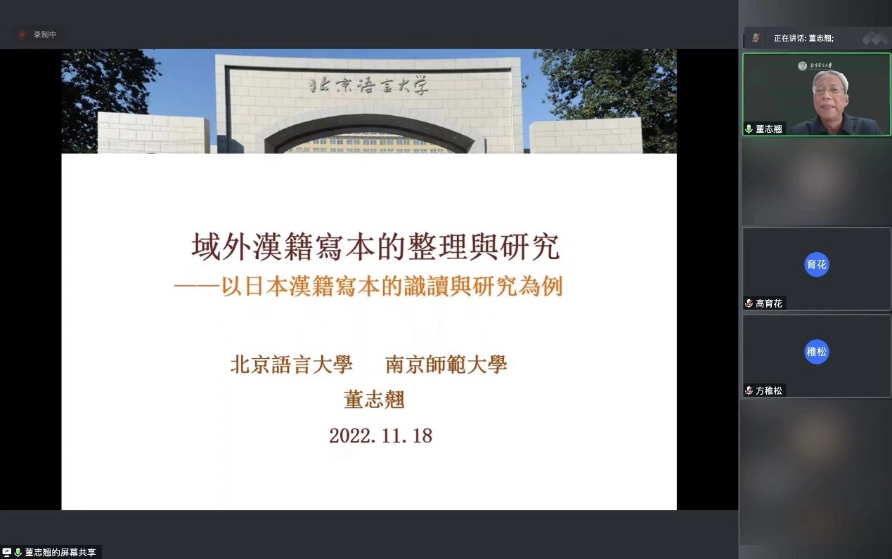 2022年11月30日,北京外国语大学中国语言文学学院举办“北外文华讲堂”系列讲座,邀请国家级高等院校教学名师、北京语言大学特聘教授董志翘先生作题为《域外汉籍写本的整理与研究——以日本汉籍写本的识读与研究为例》的线上学术讲座。讲座由中国语言文学学院高育花教授主持,副院长方稚松及校内外师生一百三十余人参与此次讲座。