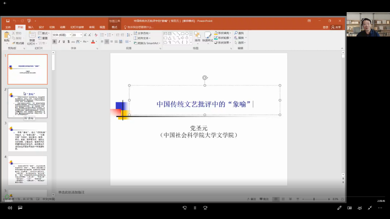 2022年6月15日,北京外国语大学中国语言文学学院举办“北外文华讲堂”系列讲座,邀请中国社会科学院研究员、中国社会科学院大学人文学院教授、博士生导师党圣元教授做题为《中国传统文艺批评中的“象喻”》的线上学术讲座。讲座由中国语言文学学院执行院长李建盛教授主持,av中文在线院长詹福瑞教授、学院师生及校内外文学爱好者共200余人参与本次讲座。
