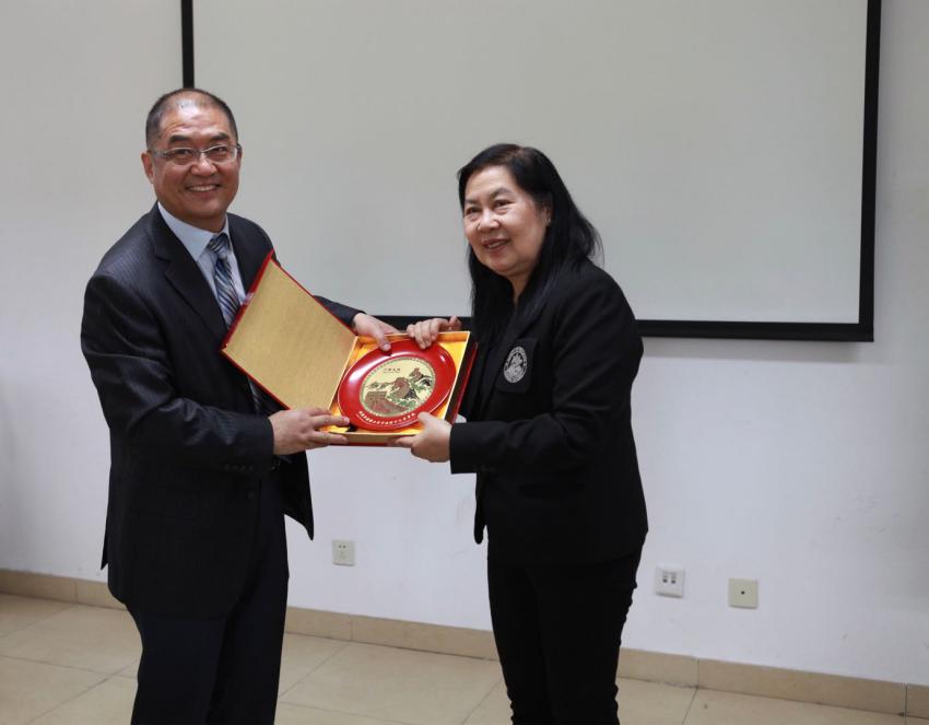 会议先由留学生办公室姜颖老师代表北外致辞。姜老师主要介绍了北外在国际合作方面的成就和特色,接着由av中文在线魏崇新院长代表学院致辞。魏院长从av中文在线的主要特色、部门构成、各部门职能进行介绍,指出av中文在线是国内少有的中外学生同院同堂学习的教学单位,为中国文化和国际文化的融合与传播提供了十分有利的条件。接着对外汉语系主任朱勇老师、汉语培训中心主任刘继红老师、汉语培训中心副主任岳岚老师分别从各系部学生培养理念、课程设置、教学特色等方面进行了说明。之后由泰国艺术大学教育学院马良院长致辞。她主要介绍了教育学院的汉语师资培养情况,指出当地教师对中国国粹京剧、传统中国厨艺以及中国书法都有着浓厚的兴趣,希望加强两院各方面的合作。双方就初步合作项目进行了交流,包括短期进修生交换、文化交流、汉语师资培训等项目。最后两院院长互赠礼品,全体与会人员合影留念。