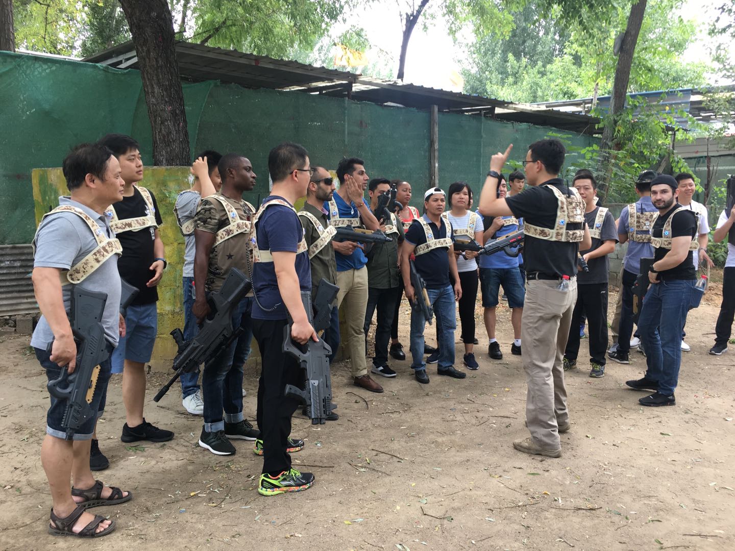 在野战基地,活动双方都找到了久违的职业感。他们穿上仿真装备,按照性别比例和年龄大小,均匀地分成两组,进行了真人攻守对战。真人CS活动除了需要智勇双全的攻略,精湛的射击技巧,周密的战略部署之外,更讲求合作性。在这样的模拟实战中,国籍、级别都被忽略,大家密切配合,团结一心,目标一致,取得胜利。