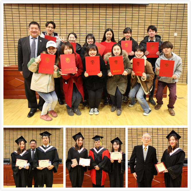 毕业典礼首先由李冰老师为全体毕业生送上临别赠言,随后由张晓慧院长向所有获得学位的学生表示祝贺,来自日本NPO法人国际交流教育后援会理事铃木辉康先生最后致辞。优秀毕业生代表镰田真理惠同学在毕业典礼上作为毕业生代表进行发言,她讲述四年留学生活中的点点滴滴,四年的师恩难忘,四年的友情难舍,最终在老师们的祝福视频结束后,毕业典礼落下帷幕。