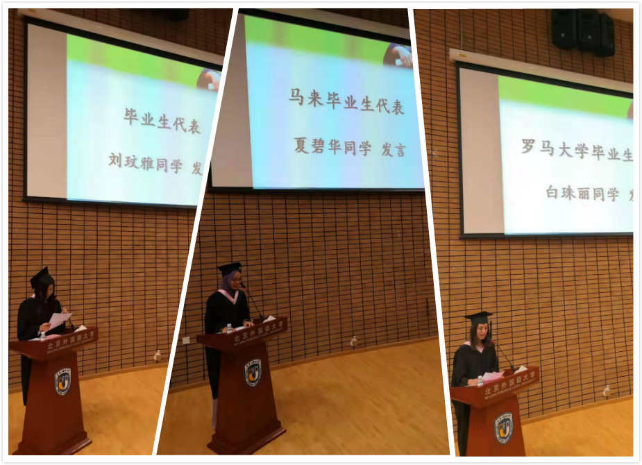 留学生办公室主任李冰在毕业典礼上致词,av中文在线执行院长张晓慧为毕业生送上临别祝福。他们对同学们顺利毕业表示由衷祝贺,对同学们的未来寄予了热情的期待。