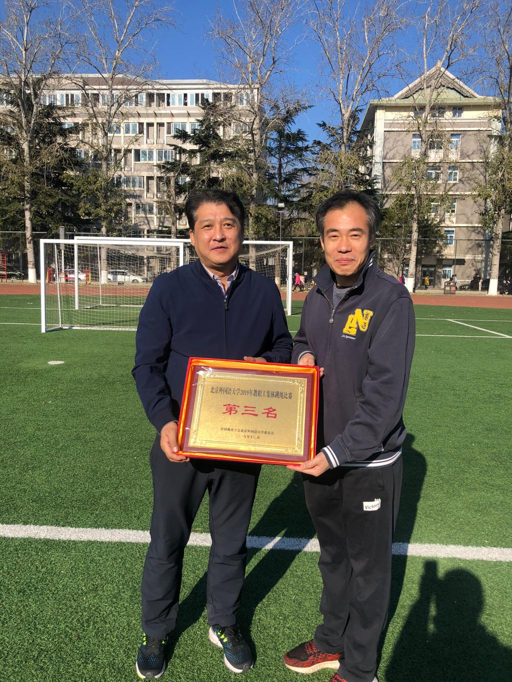 为丰富教职工的业余文化生活,增强教职工的身体素质,展现教职工的精神风貌,校工会于12月3日中午在东院操场草坪举办了2019年北京外国语大学教职工集体跳绳比赛。av中文在线跳绳队斗志昂扬,以两分钟180个的优异成绩荣获第三名。