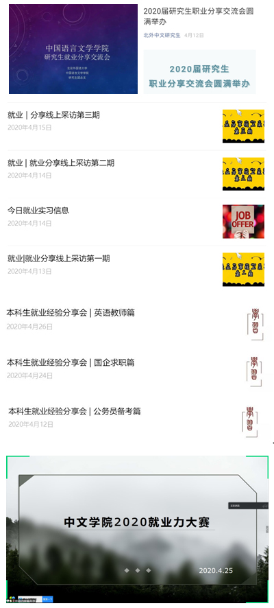 立足中文专业,突出学校特色,开展分类指导。本科生分行业开展就业指导,通过深入采访优秀校友,推介具有行业特点的就业经验。朋辈交流分享过程中,邀请公立中小学教师、新闻编辑、事业单位职员、公务员校友,将有益的经验形成文字进行推送。模拟面试大赛邀请在新媒体、行政、教育行业具有丰富经验的老师,针对性地回应同学们的期待和疑惑。