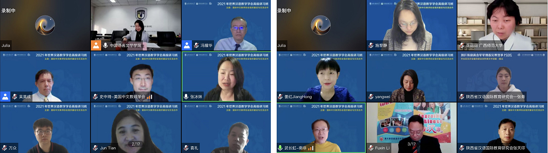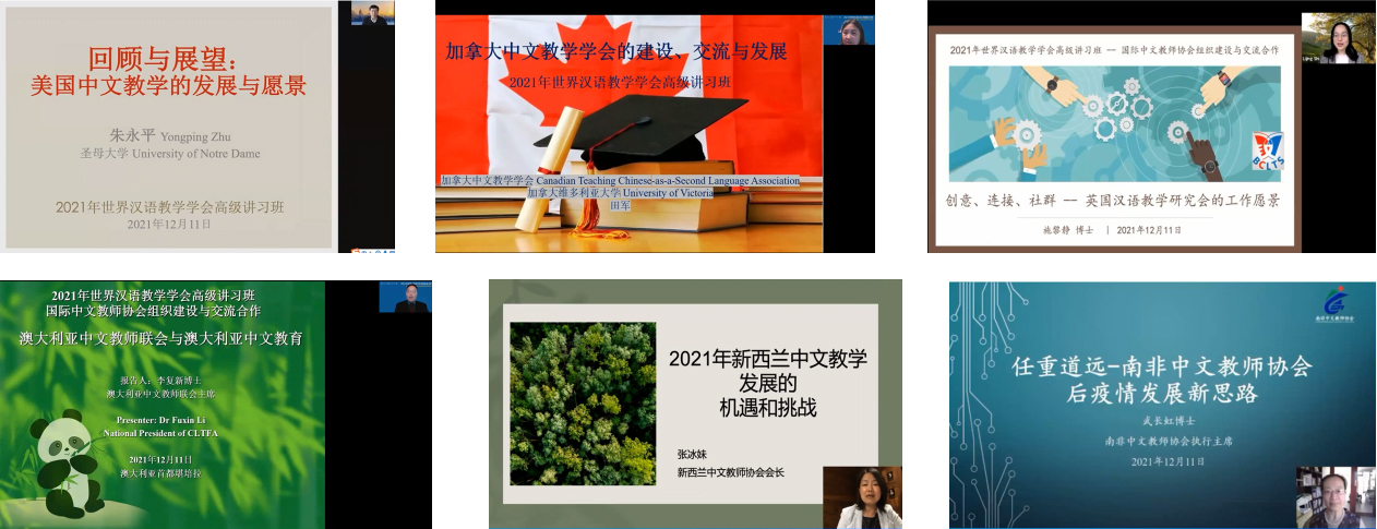 为支持海内外一线教师、专家学者发起建设社会团体组织,加强国际中文教师协会组织的交流合作,世界汉语教学学会与亚太地区汉语教学学会合作,于2021年12月11日举办了“2021年世界汉语教学学会高级讲习班”,讲习班的主题为“国际中文教师协会组织建设与交流合作”,由世界汉语教学学会、亚太地区汉语教学学会主办,北京外国语大学中国语言文学学院承办,《国际中文教育(中英文)》期刊编辑部协办,通过线上线下相结合、录播与直播相结合的方式举行。本次讲习班邀请了美国、英国、加拿大、澳大利亚、新西兰、南非等六个英语为主导语言国家的中文教师协会负责人进行专题报告,并举办圆桌论坛,邀请上述各国代表和中国天津、安徽、陕西等地的国际中文教育组织代表进行深入探讨。