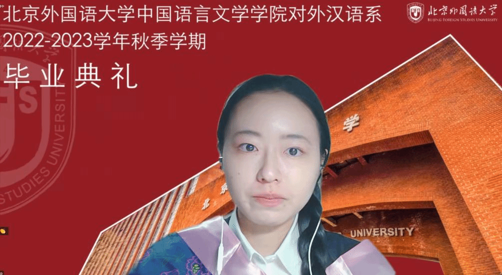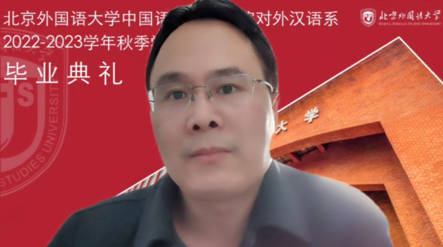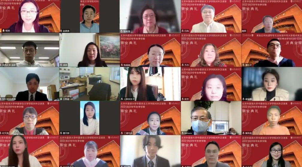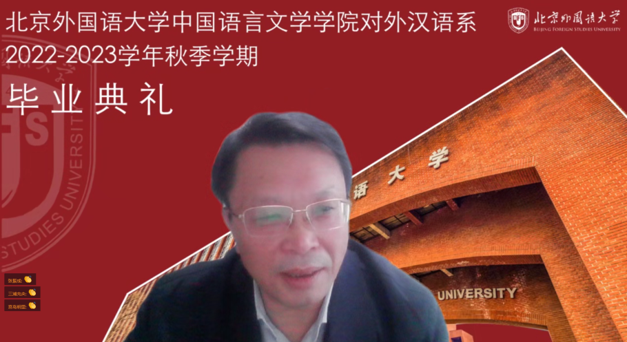 2022年12月22日,北京外国语大学中国语言文学学院对外汉语系2022——2023学年秋季学期本科留学生毕业典礼在腾讯会议平台如期举行。日本NPO法人国际交流教育后援会理事长木村太郎、事务局次长郑新培、日本关西大学外国语学部副教授金佳、日本NPO法人国际交流教育后援会事务局员王野晶、学生辅导员松田贵博、北京外国语大学国际处副处长李茂林、av中文在线执行院长李建盛、副院长白亮、副书记曹文婷、国际事务中心负责人张晓慧、行政办公室主任王慕尧、留学生工作室主任成苗、对外汉语系任课教师、全体毕业生及家长通过腾讯会议平台参加了毕业典礼。毕业典礼由对外汉语系主任杨旭主持。