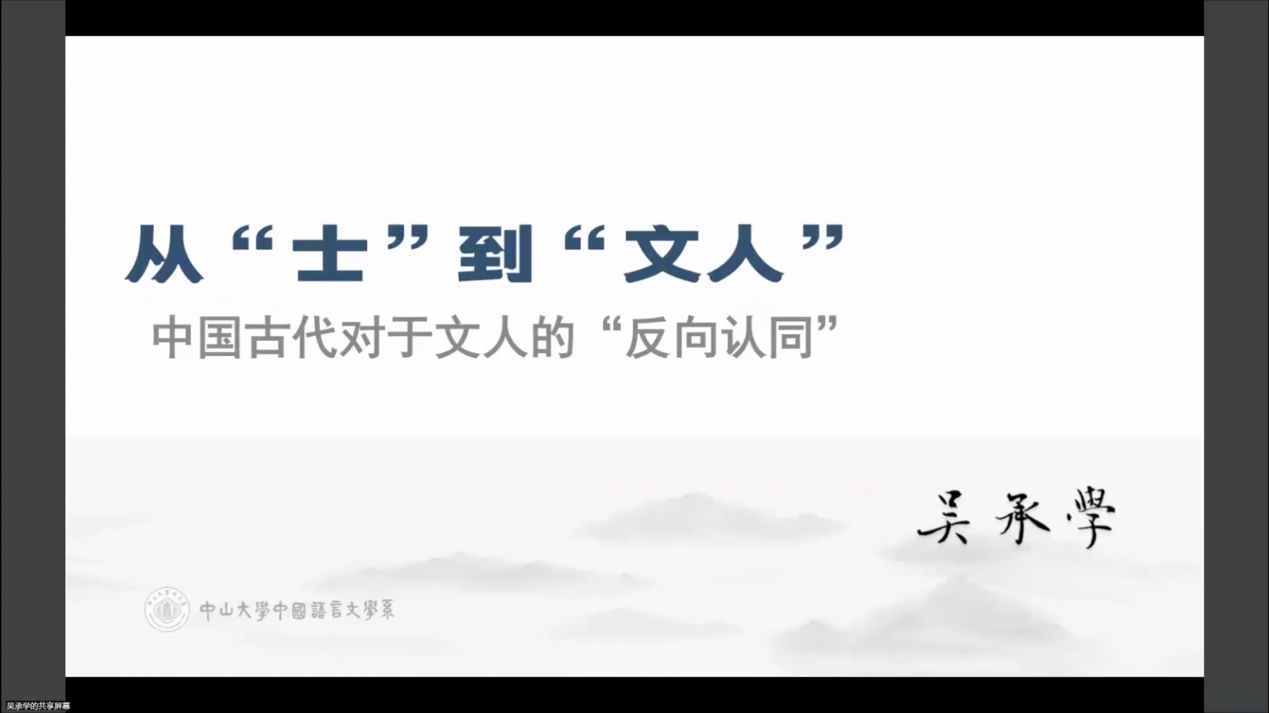 2022年12月7日下午,中山大学中文系教授、博士生导师、中山大学“逸仙学者”讲座教授、教育部“长江学者特聘教授”吴承学先生应邀做客“北外文华讲堂”,以线上方式作了题为《从“士”到“文人”——中国古代对于文人的“反向认同”》的报告。报告由北外中国语言文学学院学术委员会主任魏崇新主持,中国语言文学学院院长詹福瑞、副院长方稚松以及学院师生共一百余人参与。
