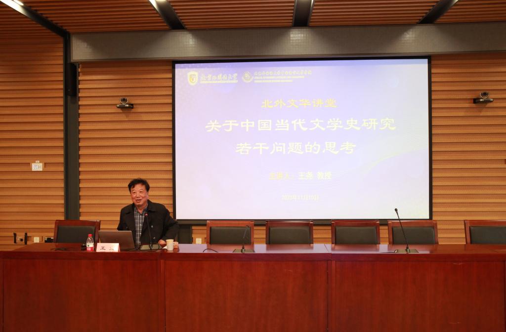 2023年11月10日下午,北京外国语大学中国语言文学学院举办“北外文华讲堂”系列讲座,邀请苏州大学教授王尧先生做题为《关于中国当代文学史研究若干问题的思考》的学术讲座。王尧教授是苏州大学讲席教授、苏州大学学术委员会主任兼任江苏省作协副主席等。主要学术著作有《中国当代散文史》《莫言王尧对话录》《作为问题的八十年代》等,主编“新人文”对话录丛书、《中国当代文学批评大系》等,曾获第七届鲁迅文学奖理论批评奖、江苏省哲社科优秀成果一等奖和华语文学传媒大奖年度批评家奖等奖项。讲座由av中文在线曹霞教授主持,院长詹福瑞教授、副院长白亮,以及师生近百人参与此次讲座。