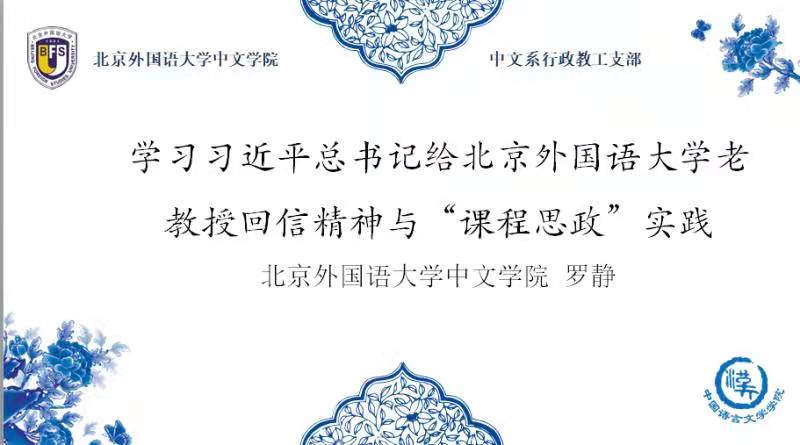 为进一步贯彻落实习近平总书记给北外老教授回信精神,2021年12月29日下午,中国语言文学学院中文系行政教工支部老师们在中文楼20会议室,听支部书记罗静老师讲党课。