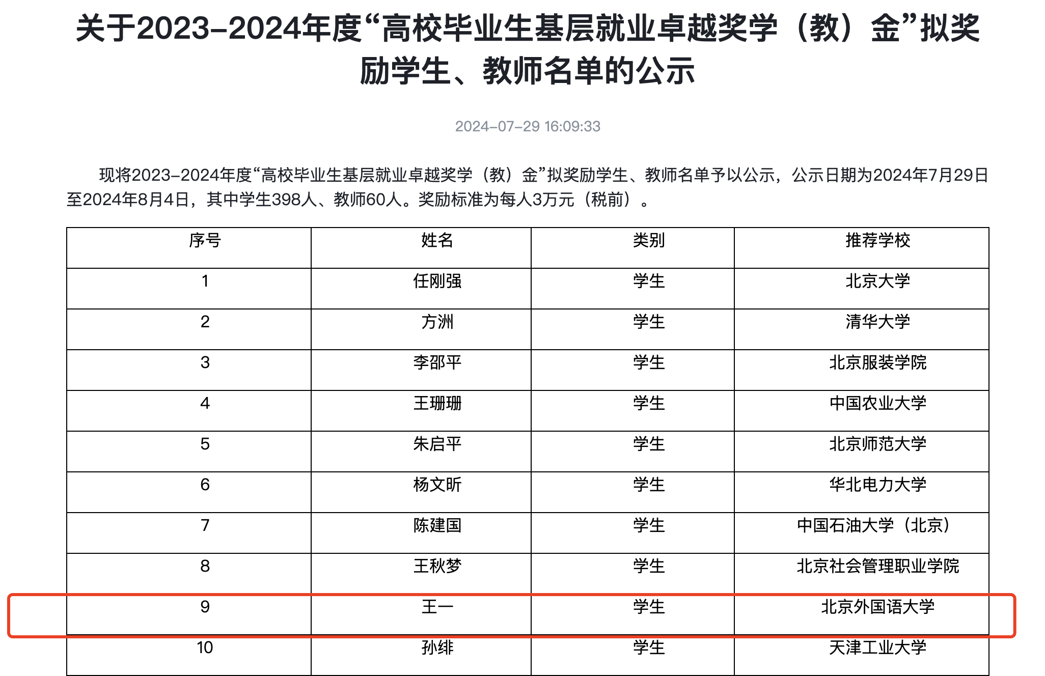 近日,中国教育发展基金会公布了2023--2024年度“全国高校毕业生基层就业卓越奖”获奖人选。中国语言文学学院2013届毕业生王一荣获“全国高校毕业生基层就业卓越奖”。